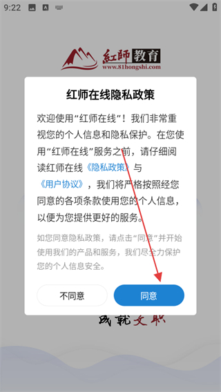 1、打開紅師在線APP,在彈出的紅師在線隱私政策界面,點(diǎn)擊同意。