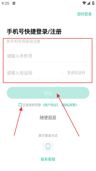4、輸入手機(jī)號(hào)碼、驗(yàn)證碼,勾選用戶協(xié)議和隱私政策,點(diǎn)擊登錄。