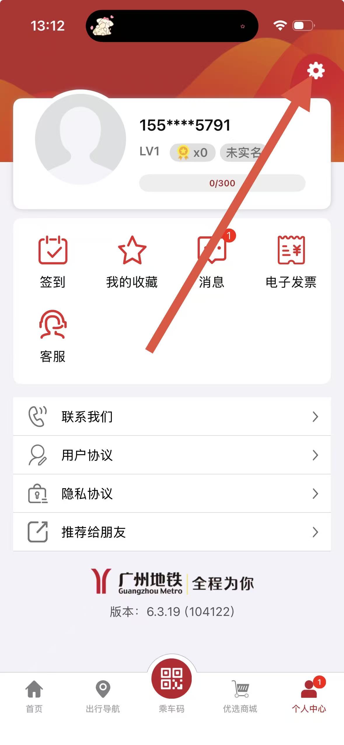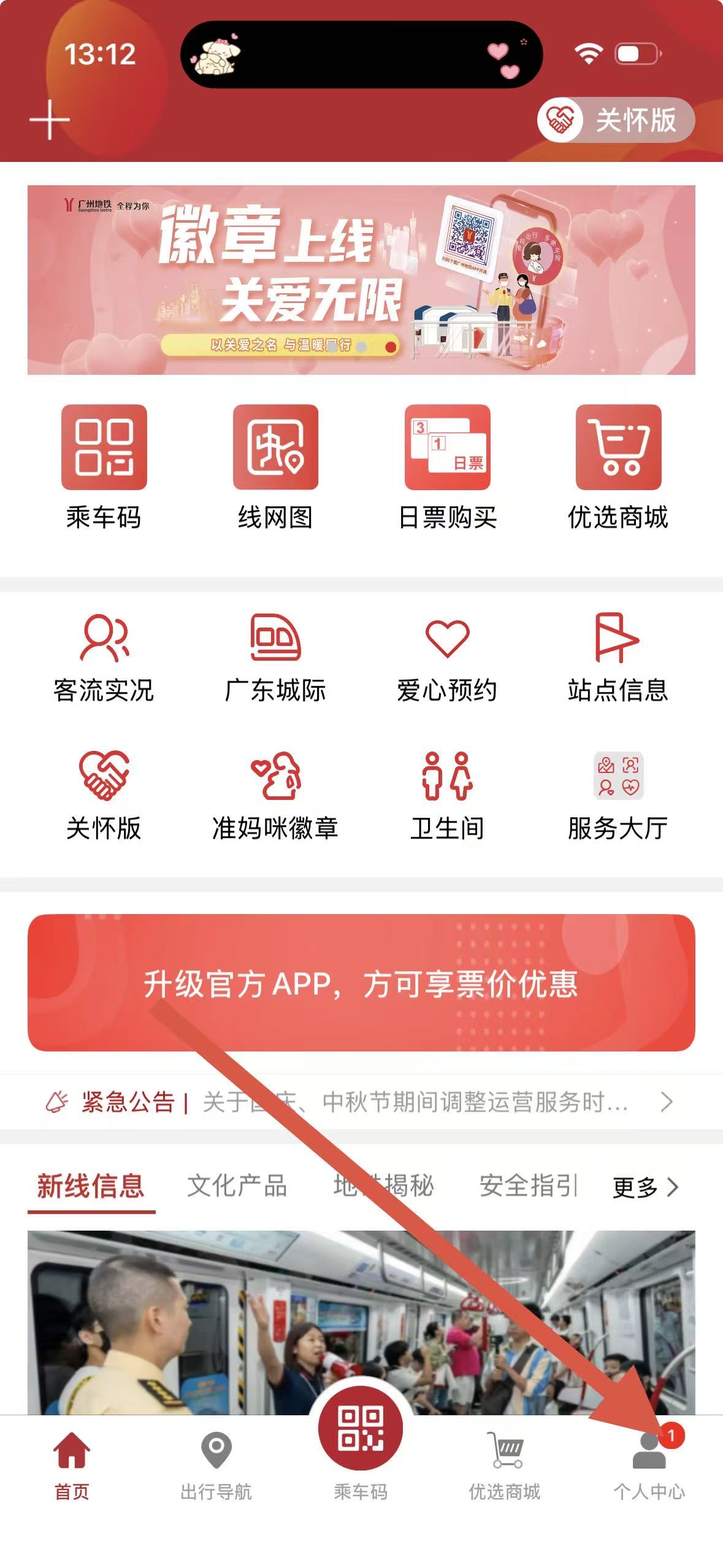 1、打開廣州地鐵app,在首頁點擊右下角個人中心。