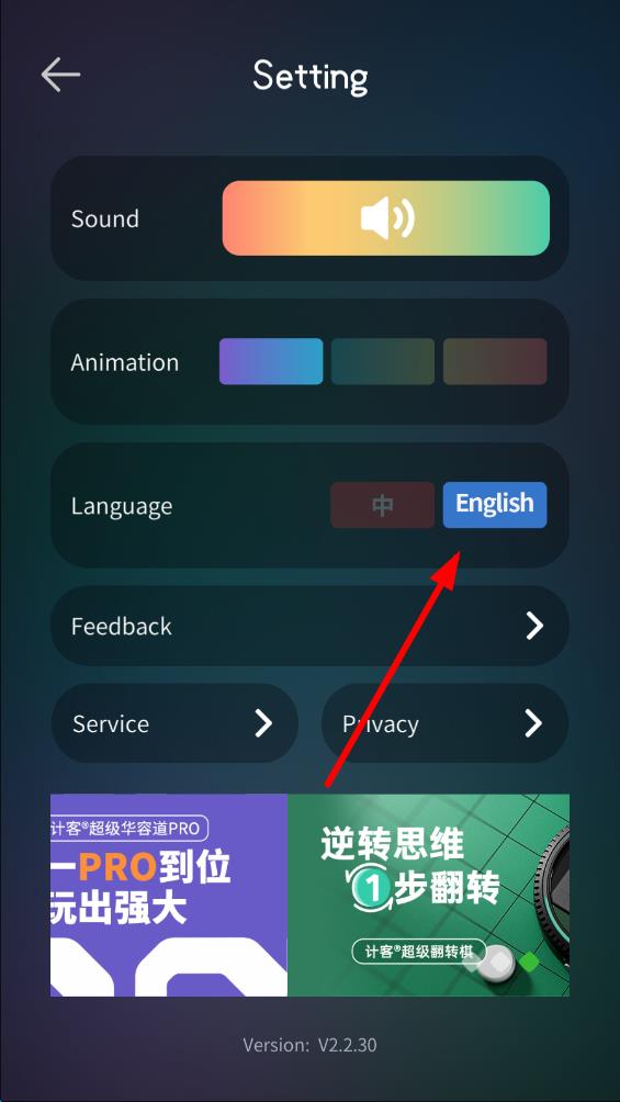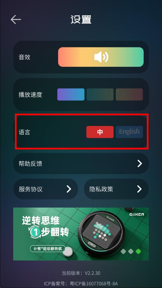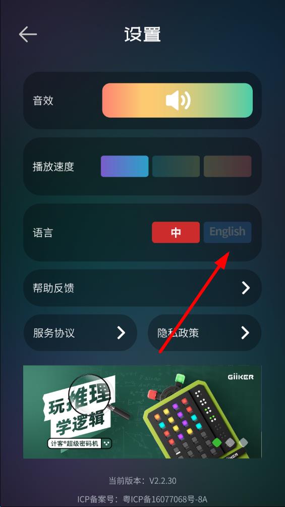 3、點(diǎn)擊語(yǔ)言選項(xiàng)右側(cè)標(biāo)有English的灰色按鈕,將語(yǔ)言選項(xiàng)切換。
