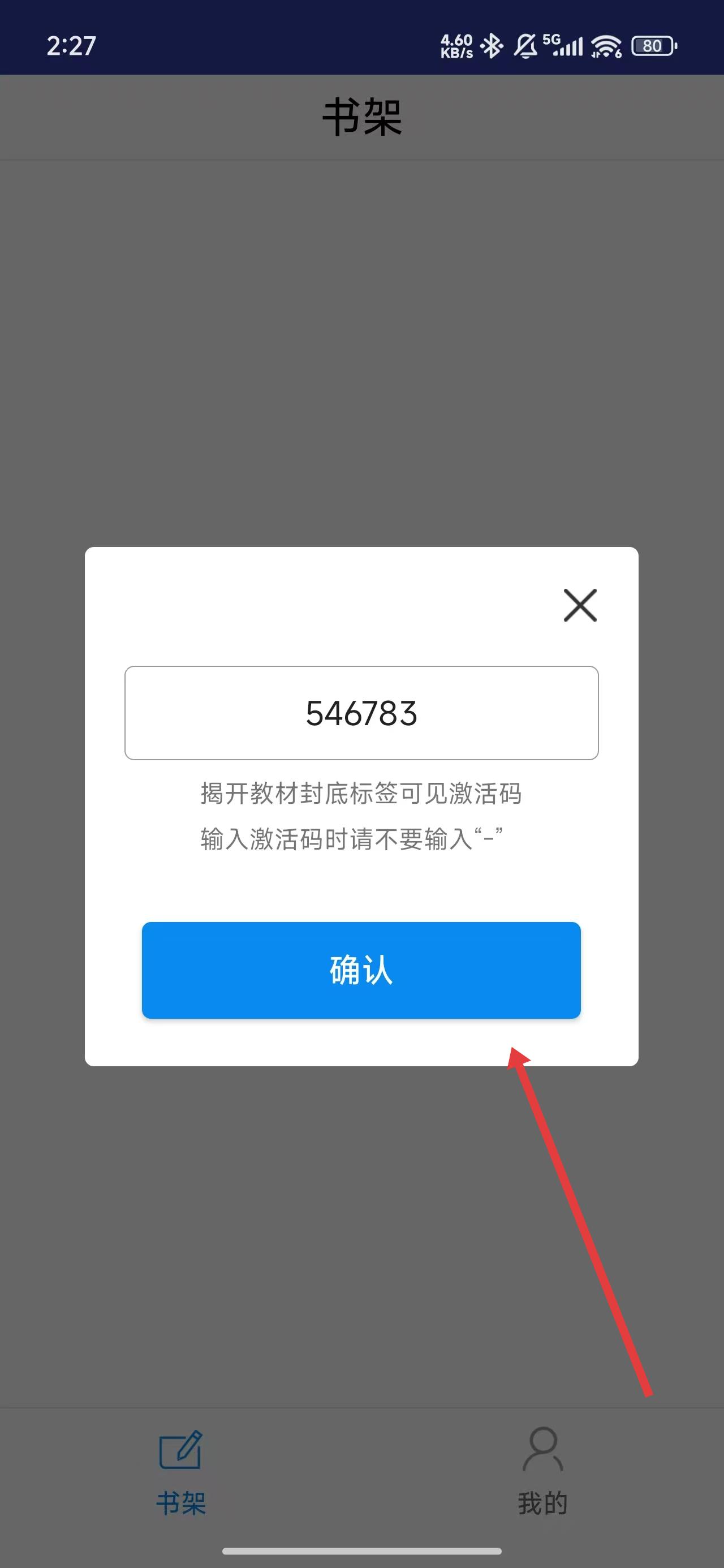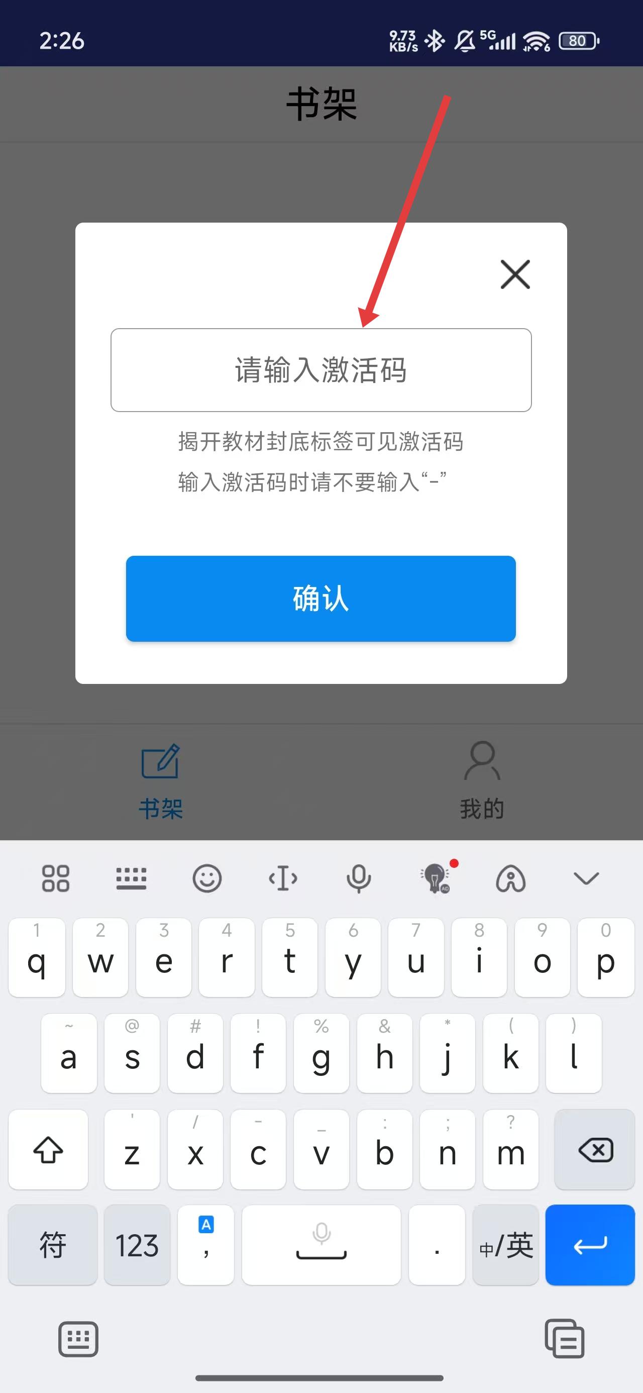 3、可以通過點擊彈窗中的輸入框,進行填寫激活碼添加教材。