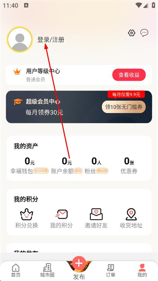 2、在我的頁面中,找到并點(diǎn)擊登錄/注冊區(qū)域。
