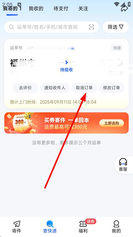 2、在我寄的頁面中找到需要取消的寄件訂單,點(diǎn)擊訂單下方的取消訂單按鈕。