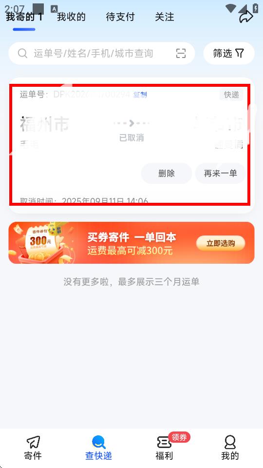 4、成功取消寄件訂單,之后可在訂單列表中查看訂單狀態(tài)顯示為已取消。