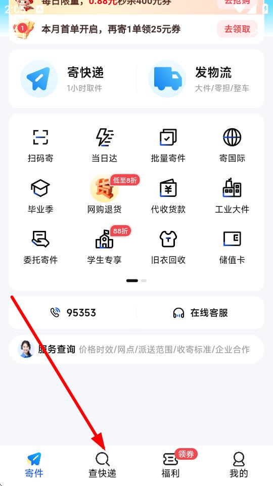 1、打開德邦快遞APP進(jìn)入首頁,點(diǎn)擊底部導(dǎo)航欄中的查快遞選項(xiàng)。