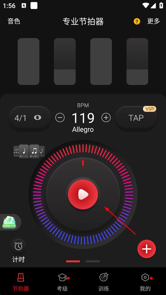 4、回到專(zhuān)業(yè)節(jié)拍器頁(yè)面,點(diǎn)擊中間紅色播放按鈕,開(kāi)始使用設(shè)置好的節(jié)拍。