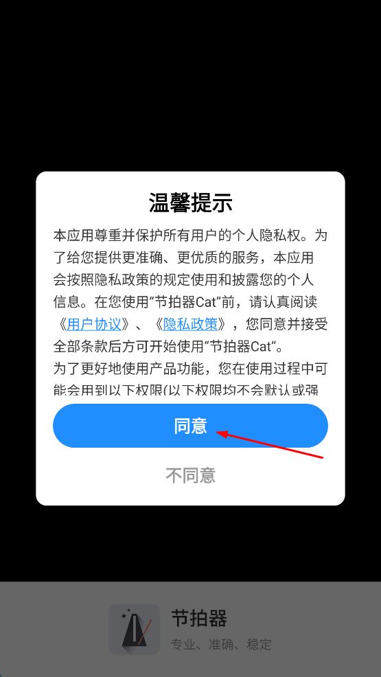 1、打開(kāi)節(jié)拍器Cat App,出現(xiàn)溫馨提示彈窗,閱讀后點(diǎn)擊同意按鈕。