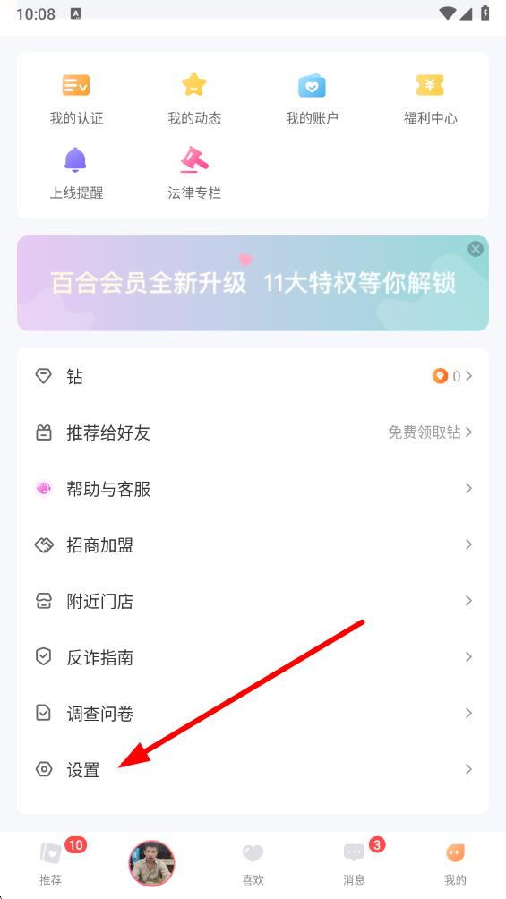 2、進(jìn)入我的頁面后,點(diǎn)擊設(shè)置的選項(xiàng),進(jìn)入設(shè)置界面。