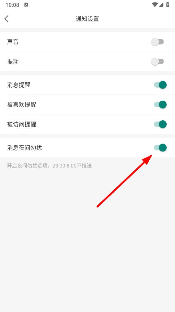 4、進(jìn)入通知設(shè)置頁面,找到消息夜間勿擾選項(xiàng),點(diǎn)擊其右側(cè)的開關(guān)按鈕,將其關(guān)閉,即可關(guān)閉夜間模式。