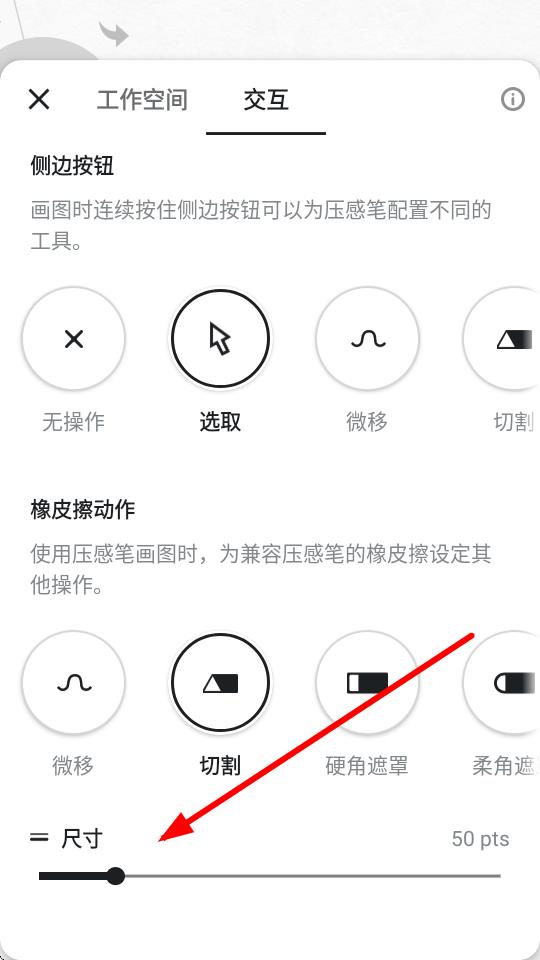 4、在設(shè)置的交互頁面,找到尺寸的滑塊,來調(diào)整橡皮擦尺寸。