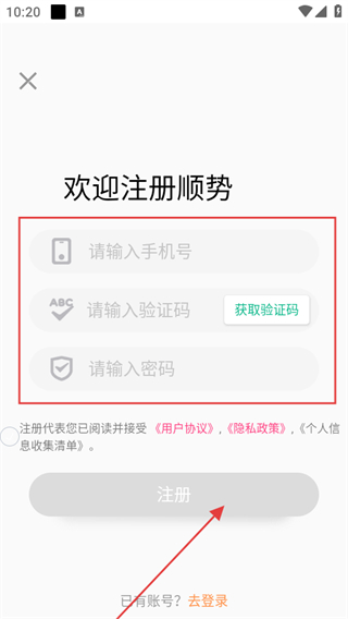 3、輸入手機(jī)號、驗(yàn)證碼,設(shè)置密碼,勾選同意相關(guān)協(xié)議后,點(diǎn)擊注冊。