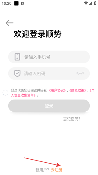 2、進(jìn)入登錄界面后,點(diǎn)擊下方新用戶?去注冊的文字,進(jìn)入注冊頁面。