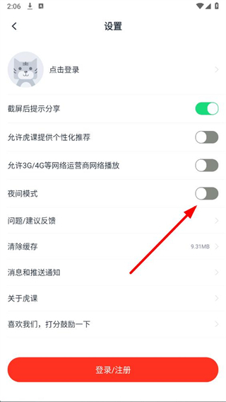 3、在設(shè)置頁(yè)面,找到夜間模式選項(xiàng),點(diǎn)擊其右側(cè)的開關(guān)按鈕將其開啟即可。
