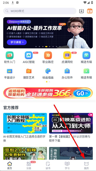 1、在虎課首頁(yè),點(diǎn)擊右下角我的,進(jìn)入個(gè)人頁(yè)面。