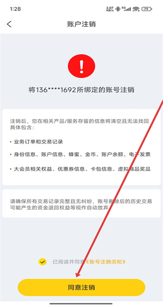 3、在進(jìn)入到賬戶(hù)注銷(xiāo)頁(yè)面中,勾選好同意按鈕后,點(diǎn)擊同意注銷(xiāo)按鈕開(kāi)始注銷(xiāo)操作。