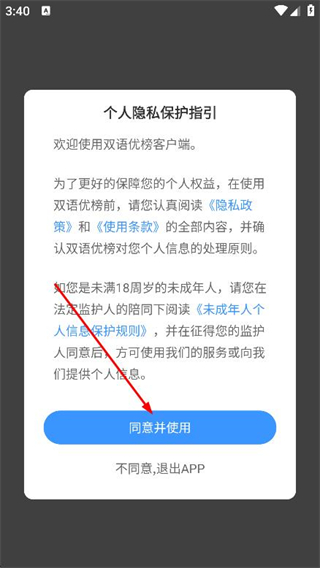 1、打開雙語(yǔ)優(yōu)榜APP,在彈窗中點(diǎn)擊同意并使用。