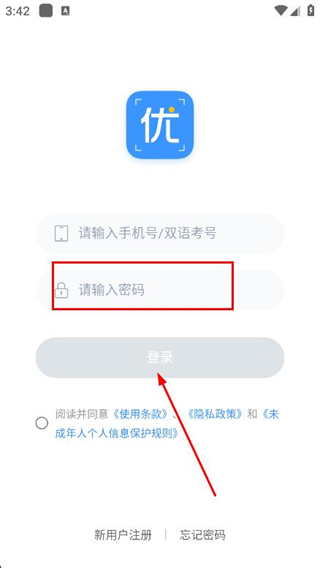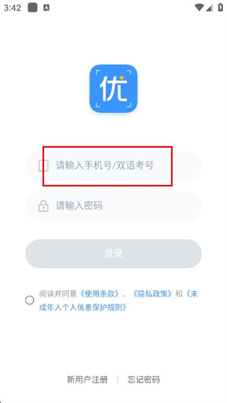 2、在登錄頁(yè)面的輸入框中,輸入手機(jī)號(hào)/雙語(yǔ)考號(hào)。