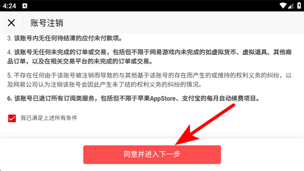 3、在注銷條件確認(rèn)頁面,勾選滿足條件后點擊同意并進(jìn)入下一步。