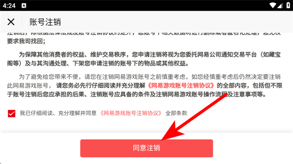 4、勾選同意注銷協(xié)議后,點擊同意注銷,完成賬號注銷的操作。