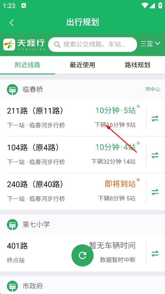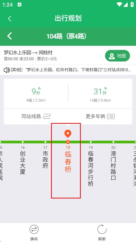 3、在出行規(guī)劃頁面,選擇想要乘坐的公交線路,比如104路(原4路),點擊進入該線路的詳細信息頁面。