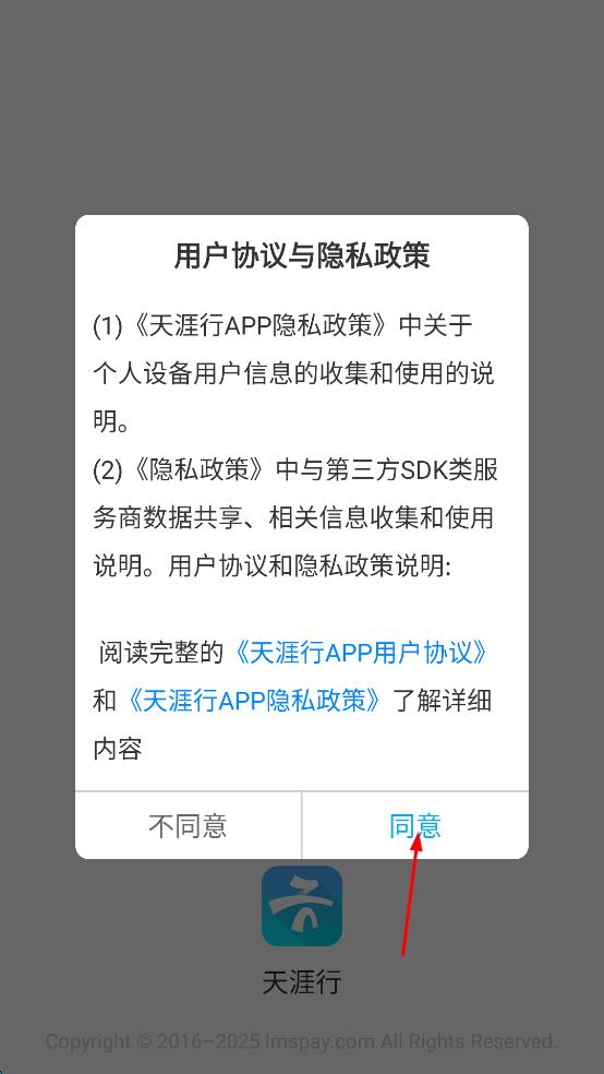 1、打開天涯行APP,在用戶協(xié)議與隱私政策界面,仔細閱讀相關(guān)內(nèi)容后,點擊同意,進入APP主界面。