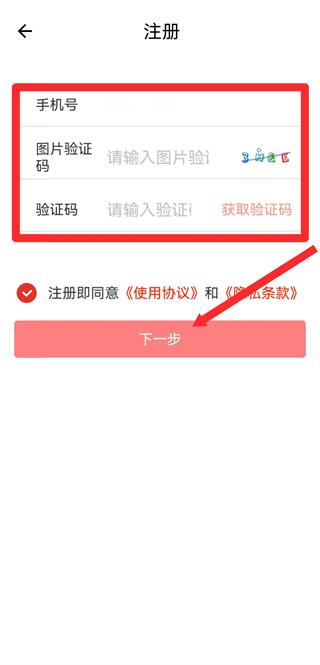 3、在注冊(cè)信息填寫頁面,輸入手機(jī)號(hào)等信息后,點(diǎn)擊下一步。