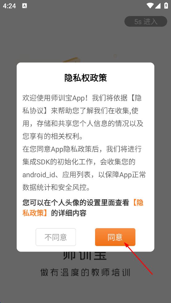 1、打開師訓(xùn)寶APP,彈出隱私權(quán)政策窗口,閱讀后點(diǎn)擊“同意”按鈕,進(jìn)入登錄界面。