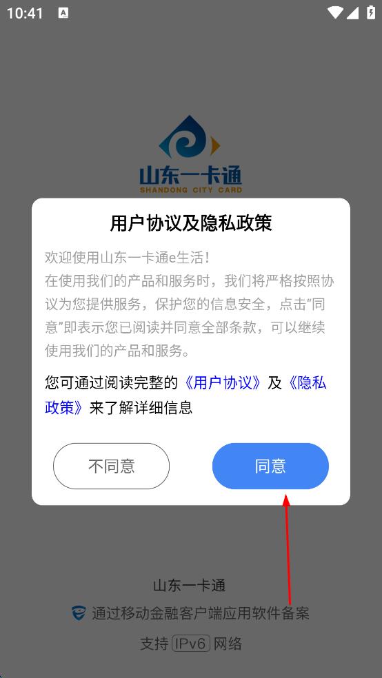 1、打開山東一卡通,會(huì)出現(xiàn)用戶協(xié)議及隱私政策界面,仔細(xì)閱讀后點(diǎn)擊“同意”,進(jìn)入軟件主界面。