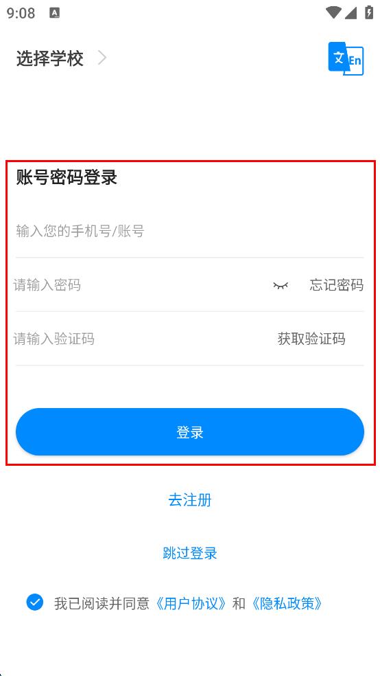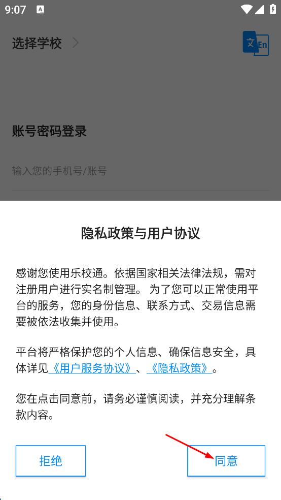 1、打開(kāi)樂(lè)校通,在彈出的隱私政策與用戶協(xié)議頁(yè)面,點(diǎn)擊同意,進(jìn)入賬號(hào)密碼登錄界面。