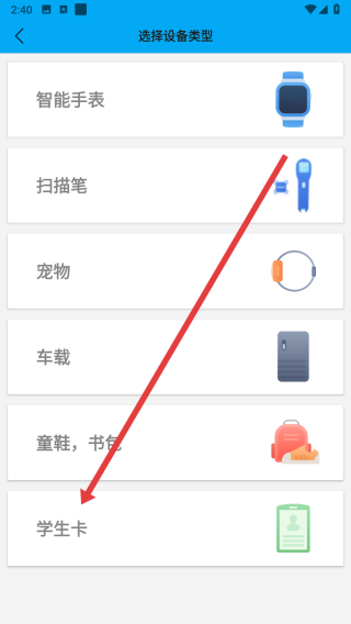 3、在選擇設(shè)備類(lèi)型頁(yè)面中,可以點(diǎn)擊底部學(xué)生卡選項(xiàng),進(jìn)入添加學(xué)生卡設(shè)備信息。