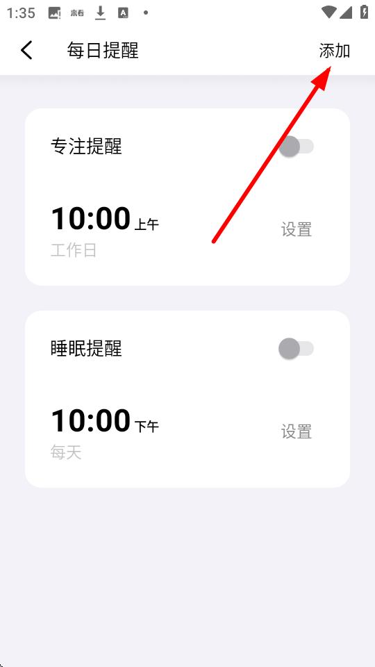 4、在每日提醒頁面,點(diǎn)擊右上角的添加按鈕,在添加提醒頁面設(shè)置,點(diǎn)擊保存,即可完成時(shí)間限制相關(guān)設(shè)置。