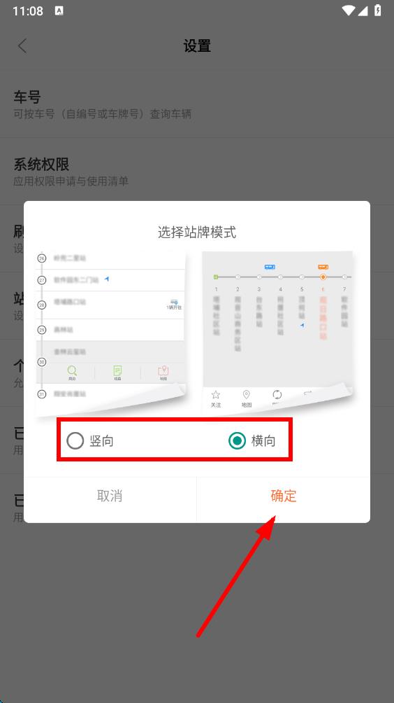 4、在彈出的窗口中,選擇豎向或者橫向模式,然后點擊確定按鈕,即可完成站牌模式設置的修改。