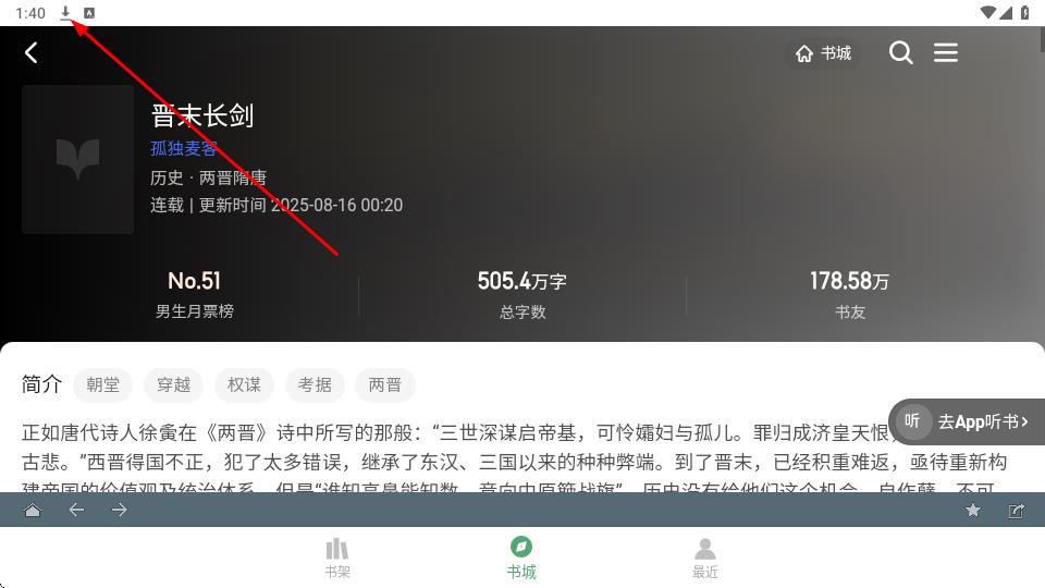 3、進(jìn)入《晉末長劍》書籍詳情頁,下方羅列男生月票榜No.51總字?jǐn)?shù)505.4萬字、書友178.58萬等數(shù)據(jù),點(diǎn)擊左上方去導(dǎo)入該本小說即可。
