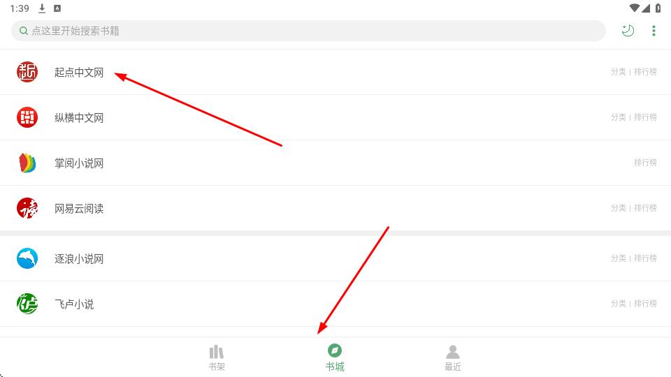 1、在閱讀APP底部導(dǎo)航欄,點(diǎn)擊書城圖標(biāo)綠色書本樣式,進(jìn)入書城頁面在平臺(tái)列表中,找到并點(diǎn)擊起點(diǎn)中文網(wǎng)選項(xiàng)左側(cè)紅底白字圖標(biāo),右側(cè)顯分類排行榜。