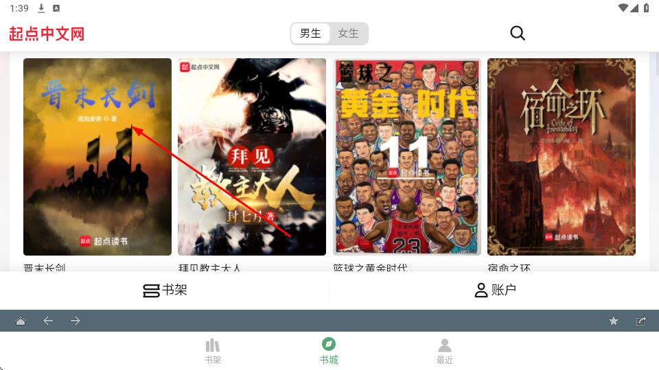 2、頁面頂部設(shè)男生、女生切換標(biāo)簽,下方陳列《晉末長劍》《拜見教主大人》等書籍封面,點(diǎn)擊《晉末長劍》封面左側(cè)首圖,背景為黃昏戰(zhàn)場,書名藍(lán)底白字。