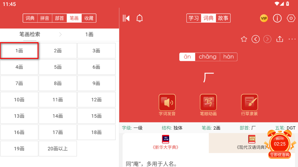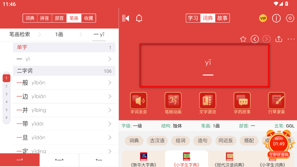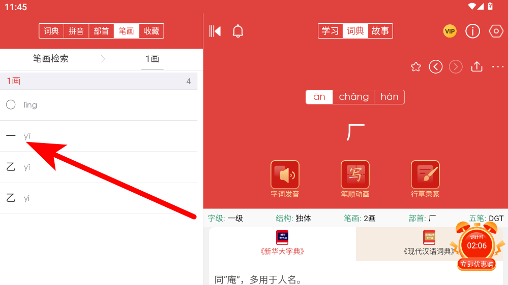4、點擊后,即可查看該字的詳細信息,如發(fā)音、筆順等。