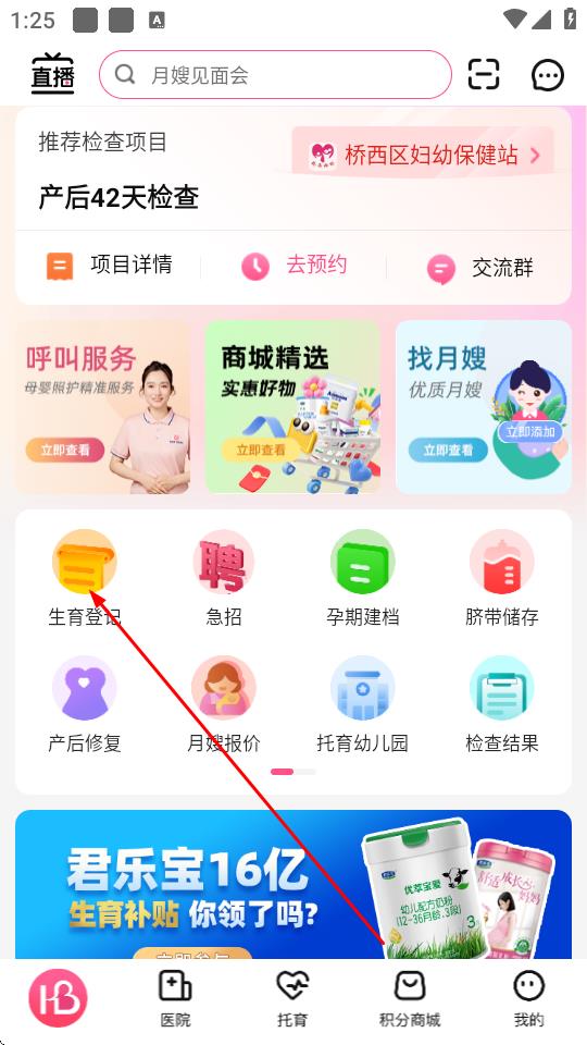 1、打開孕健康APP,在首頁點擊生育登記圖標。
