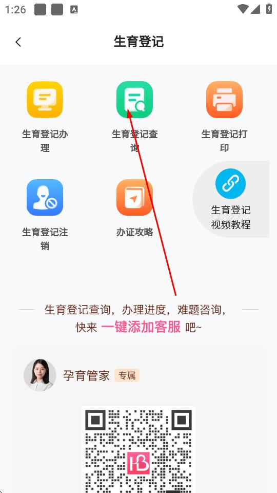 2、進入生育登記頁面后,點擊生育登記查詢選項。