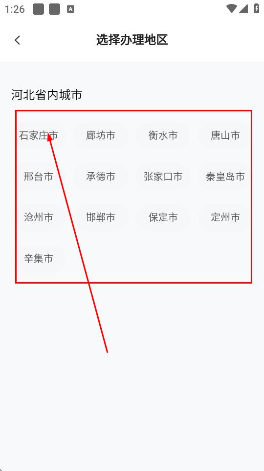 3、在選擇辦理地區(qū)頁面,選擇你辦理生育登記的地區(qū)。