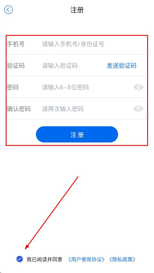 4、在注冊頁面,輸入手機號、輸入驗證碼,設(shè)置密碼,再次確認密碼,勾選我已閱讀并同意用戶使用協(xié)議隱私政策,點擊注冊。