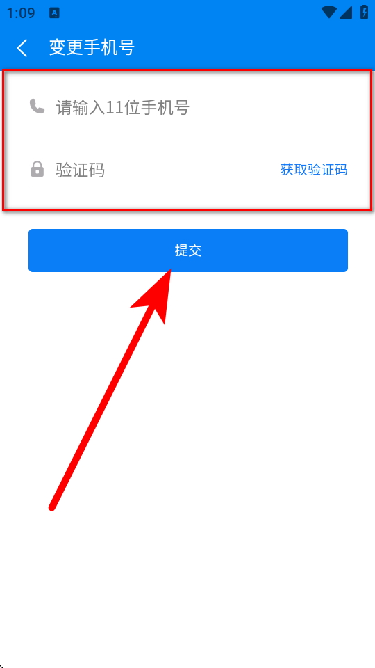 4、輸入新手機號及對應驗證碼后,點擊提交完成手機號換綁操作。
