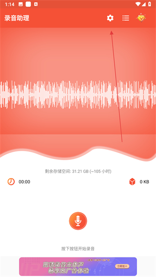 1、打開錄音助理應(yīng)用,點擊界面右上角齒輪形狀的設(shè)置圖標,進入設(shè)置頁面。