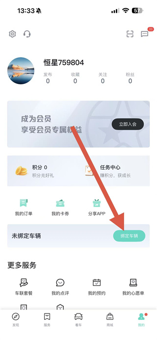 2、在個(gè)人頁面中,找到未綁定車輛區(qū)域,點(diǎn)擊右側(cè)的綁定車輛按鈕。