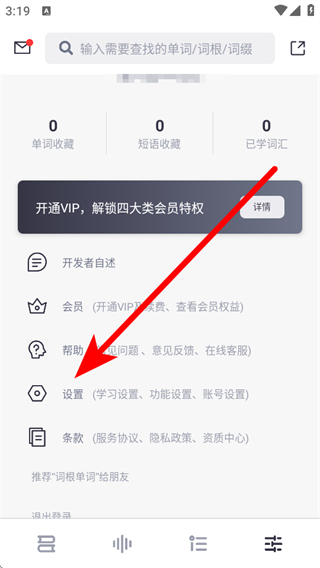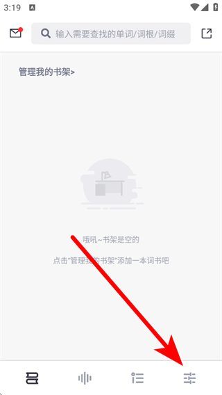 1、在詞根單詞書架頁面,點(diǎn)擊底部右側(cè)個(gè)人圖標(biāo),進(jìn)入個(gè)人功能頁面。
