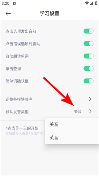 4、在頁面點(diǎn)擊默認(rèn)發(fā)音類型,選擇美音或英音,完成發(fā)音類型設(shè)置操作。