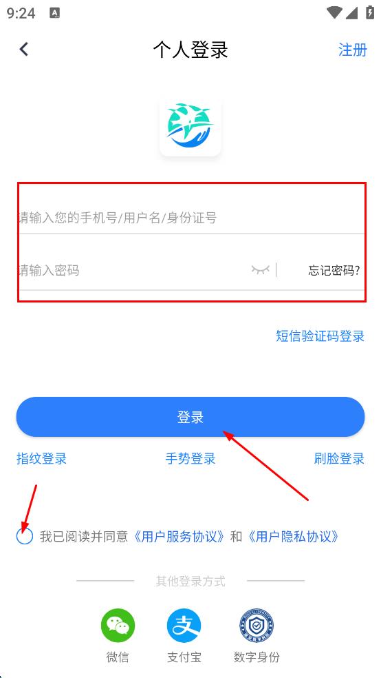 4、在個人登錄頁面,勾選已閱讀并同意相關(guān)協(xié)議,輸入手機號、密碼,點擊登錄即可。