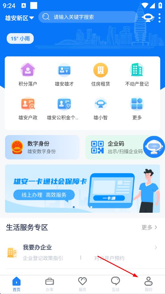 1、打開雄安相關(guān)軟件,進(jìn)入首頁后,點擊右下角我的,進(jìn)入個人頁面。