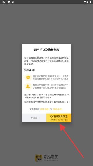 1、打開奇熱漫畫APP,進(jìn)入時會彈出用戶協(xié)議及隱私條款,點擊已閱讀并同意的按鈕。