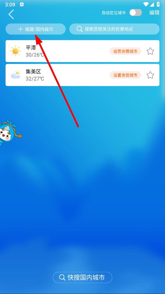 2、進(jìn)入城市管理頁(yè)面,點(diǎn)擊添加福建國(guó)內(nèi)城市的按鈕。
