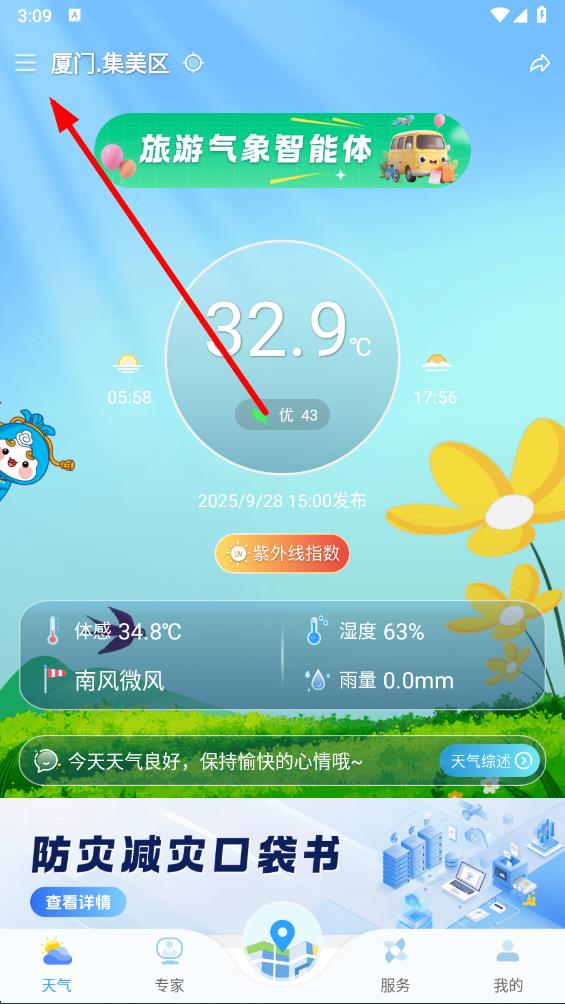 1、打開(kāi)知天氣app,點(diǎn)擊左上角當(dāng)前定位城市名稱(chēng)的位置。